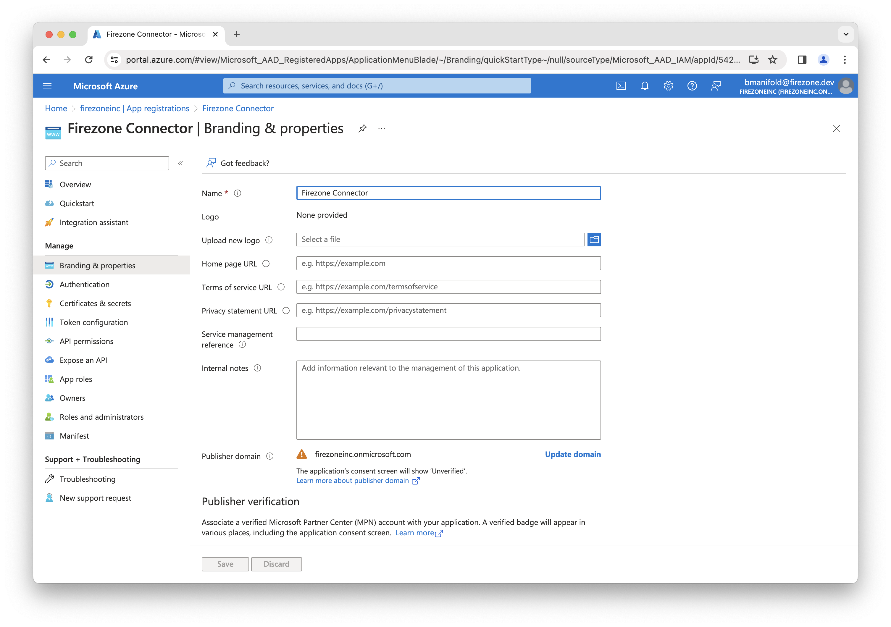 You can optionally configure branding and info for the Entra ID connector in the Branding & properties section of the app registration.